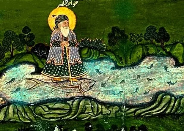 C’est en ce sens qu’il intervient par exemple auprès de Sayyidina Moussa (Moïse) dans le Coran au chapitre 18. Or, le premier Prophète vivant avant le déluge, est Idris-Enoch et c’est lui qui est représenté par deux hommes complémentaires (toujours selon l’enseignement de Sheikh Muhyyî d-din ) : Ylias (dans son aspect Jalal) qui travaille avec le feu du ciel et Khidr (dans son aspect Jamal) qui travaille avec l’eau. Ces deux prophètes sont les enseignants des « sciences de la Vie » (dont le souffle est l’essence).