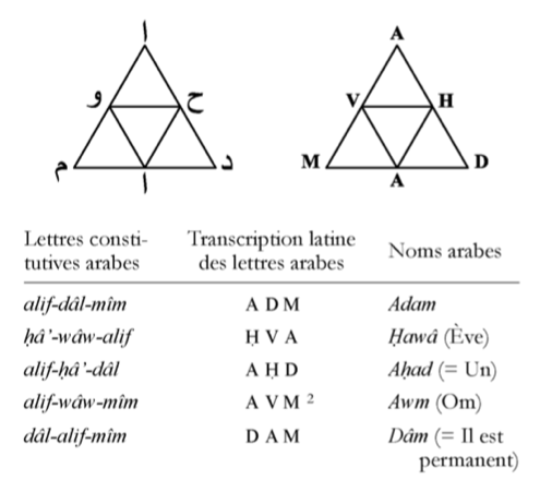 En Islam, tout ceci est également en rapport avec la manifestation de l’Univers entier par Nafass ar-Rahman, le souffle de la compassion divine maternelle exprimée dans la basmallah, bismillah ar-Rahmân ar-Rahim : « Au Nom de Dieu, toute Miséricorde, Miséricorde élective ». Je préfère donner à Rahmân une traduction féminine en français car le nom Rahmân est matriciel, et son expression est celle de la compassion de la Mère universelle. Notons que dans la basmala en arabe, le point (équivalent du bindou) sous le Ba-ب première lettre de bismillah est aussi représentative de l’Imam universel. Que Sheikh Muhhy-din désigne comme : nuqtatu al basmallah al jami’atu li ma yakun wa li ma kana (le point sous le Ba rassemble ce qui fut et ce qui est). La lettre alif qui le représente dans la manifestation est représentée en position de quatrième lettre dans la basmala ce qui est une indication allusive importante de même que la position des autres alifs dont celui qui est caché dans le Nom Allah (représentant l’Imam caché).